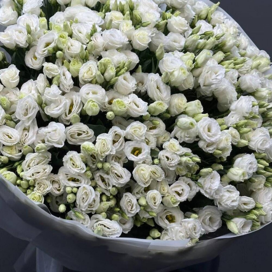 На фото букет из 101 белой эустомы. В составе: эустома (лизиантус) 101 шт, дизайнерская упаковка 4 шт, атласная лента 3 шт, . Все цветы свежие и ароматные, букет красиво оформлен и отлично подходит для подарка. Доступна доставка цветов или самовывоз.