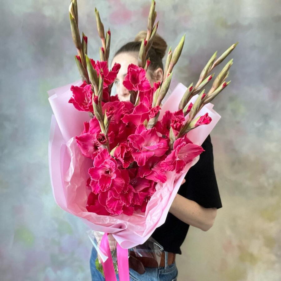На фото букет из 7 малиновых гладиолусов. В составе: гладиолус 7 шт, дизайнерская упаковка 2 шт, атласная лента 1 шт, . Все цветы свежие и ароматные, букет красиво оформлен и отлично подходит для подарка. Доступна доставка цветов или самовывоз.