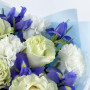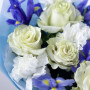 Букет из белых гвоздик, синих ирисов и белых роз в Вилючинске