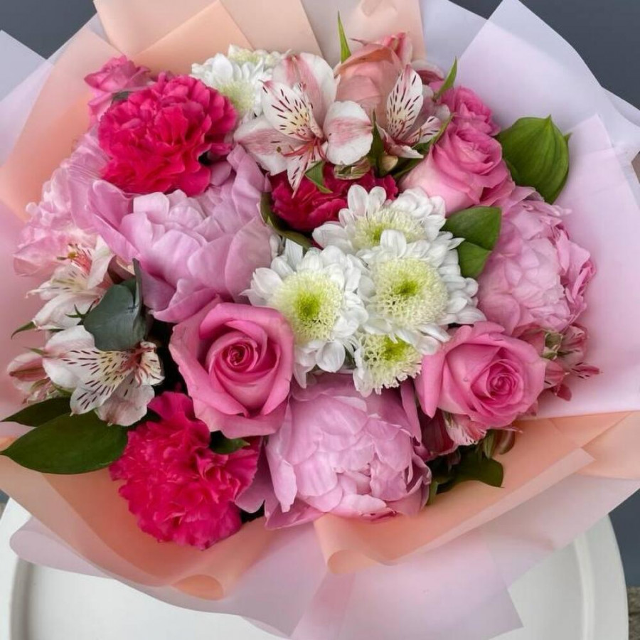 На фото букет «игра нежности». В составе: пион 5 шт, хризантема кустовая 2 шт, роза 5 шт, гвоздика 3 шт, рускус 3 шт, дизайнерская упаковка 1 шт, атласная лента 1 шт, . Все цветы свежие и ароматные, букет красиво оформлен и отлично подходит для подарка. Доступна доставка цветов или самовывоз.