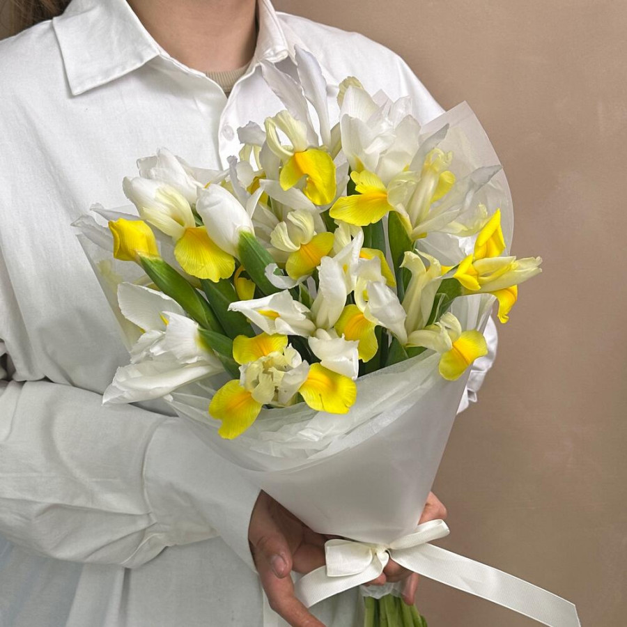На фото букет из желтых и белых ирисов. В составе: ирис 15 шт, атласная лента 2 шт, дизайнерская упаковка 2 шт, . Все цветы свежие и ароматные, букет красиво оформлен и отлично подходит для подарка. Доступна доставка цветов или самовывоз.