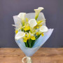 На фото букет из желтых ирисов и беллых калл. В составе: ирис 9 шт, калла 5 шт, дизайнерская упаковка 1 шт, атласная лента 1 шт, . Все цветы свежие и ароматные, букет красиво оформлен и отлично подходит для подарка. Доступна доставка цветов или самовывоз.