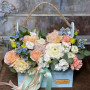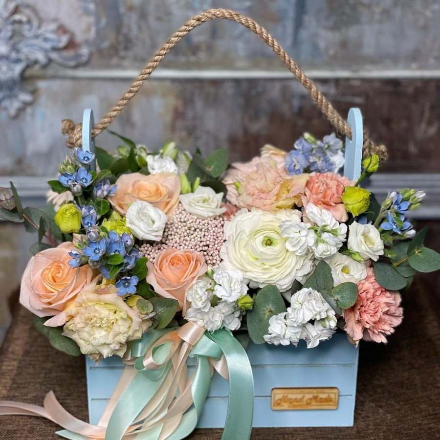 На фото композиция с цветами в голубом деревянном ящике. В составе: роза 4 шт, гвоздика 4 шт, эустома (лизиантус) 3 шт, ранункулюс 2 шт, озотамнус 3 шт, деревянный ящик (s) 1 шт, . Все цветы свежие и ароматные, букет красиво оформлен и отлично подходит для подарка. Доступна доставка цветов или самовывоз.