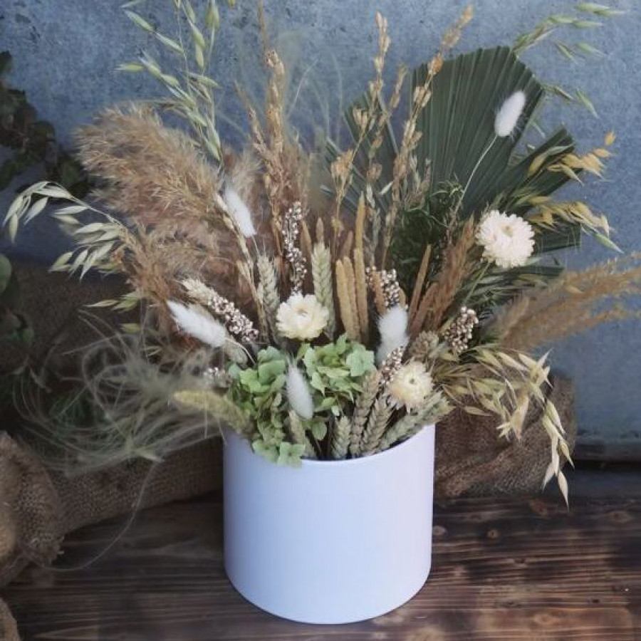 На фото сухоцветы с колосьями в шляпной коробке. В составе: сухоцветы (микс) 7 шт, колосья 2 шт, коробка (s) 1 шт, . Все цветы свежие и ароматные, букет красиво оформлен и отлично подходит для подарка. Доступна доставка цветов или самовывоз.